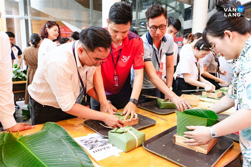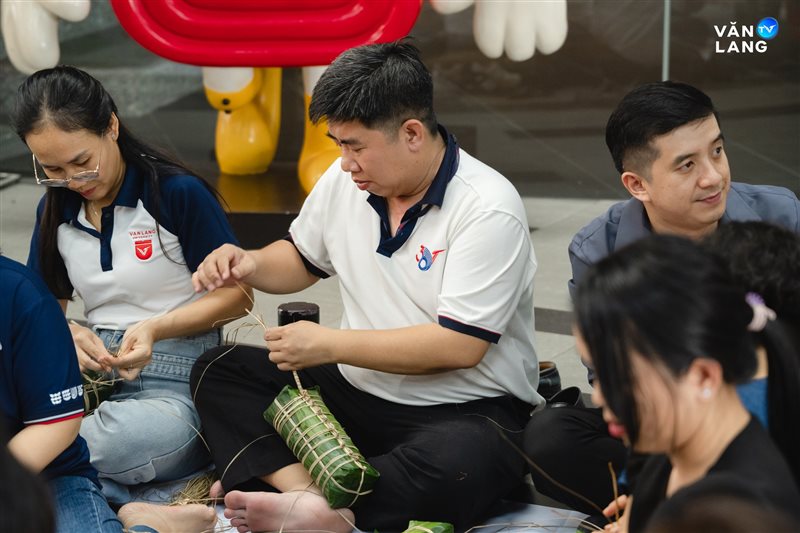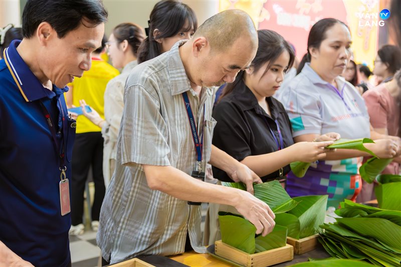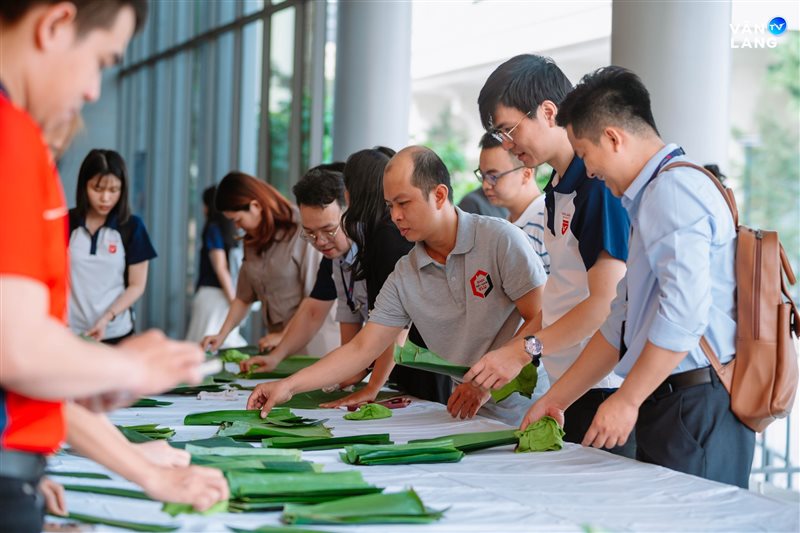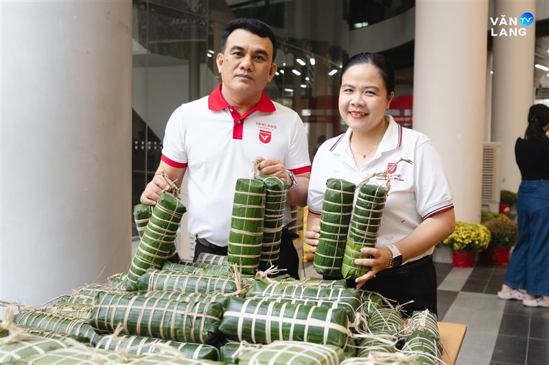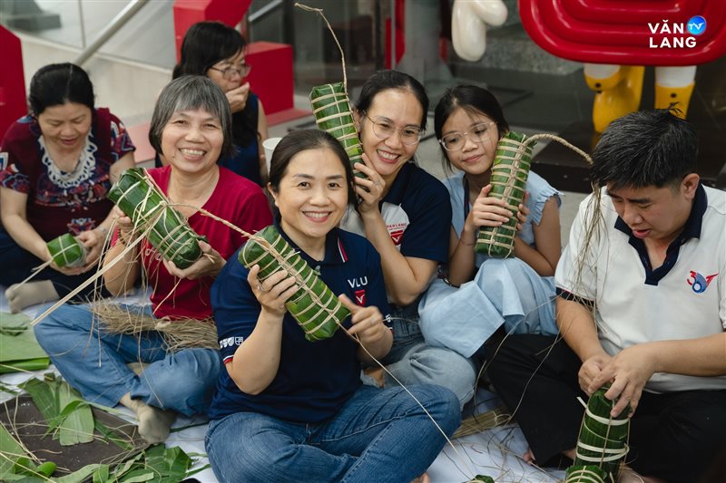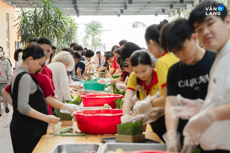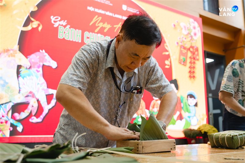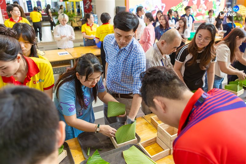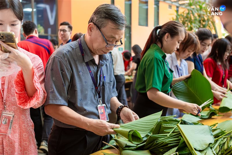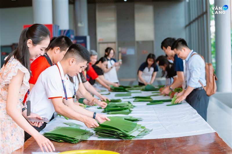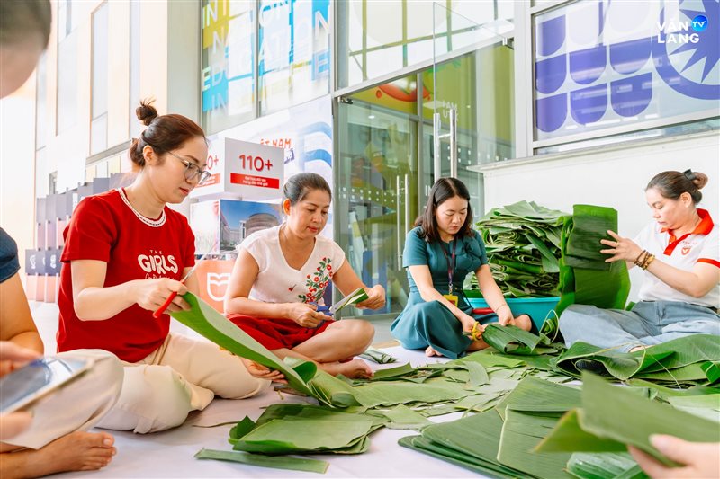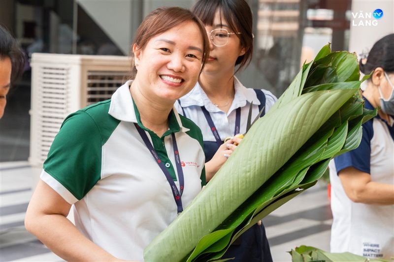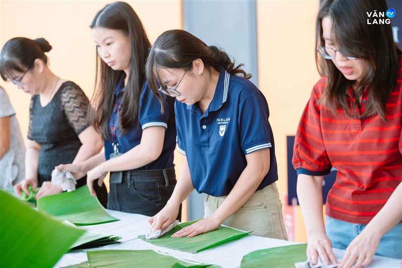 Từ khâu sơ chế nguyên liệu, tỉ mẩn cắt lá đến những đôi bàn tay khéo léo tạo hình - mỗi công đoạn đều kết tinh tâm huyết và sự nhịp nhàng của tập thể. Chính sự cộng hưởng ấy đã tạo nên những chiếc bánh không chỉ vuông vức, tròn vị mà còn gói trọn tình cảm của người Văn Lang. Qua từng nếp bánh, một bầu không khí ấm áp đã được dệt nên, mang Tết về sớm với từng ngóc ngách nhỏ trong khuôn viên Cơ sở chính.