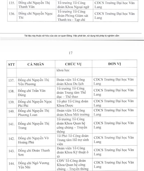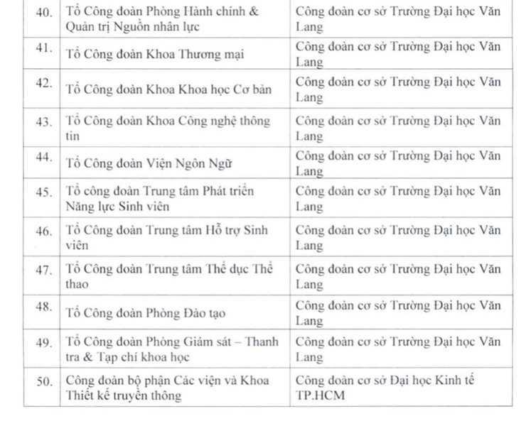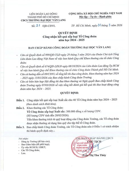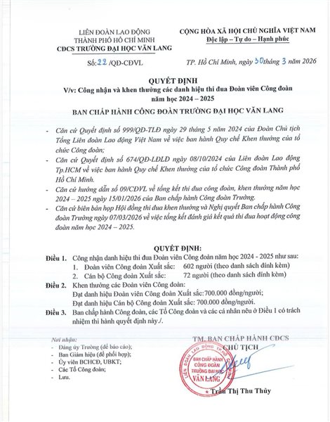 Song song với thành tích ở cấp thành phố, công tác thi đua khen thưởng nội bộ tại Văn Lang cũng ghi nhận nhiều kết quả tích cực. Theo Quyết định 21 về công nhận Tổ Công đoàn xuất sắc năm học 2024 - 2025, Ban Chấp hành Công đoàn Trường đã công nhận 40 Tổ Công đoàn xếp loại Xuất sắc. Quyết định cũng nêu rõ mức khen thưởng đối với Tổ Công đoàn xếp loại Xuất sắc là 300.000 đồng nhân với số lượng công đoàn viên của từng tổ, tính đến ngày 28/02/2026. Đây là kết quả phản ánh sự nỗ lực đồng đều của các tổ công đoàn trong việc duy trì nền nếp hoạt động, phát huy vai trò kết nối đoàn viên và góp phần hoàn thành tốt nhiệm vụ chung của nhà trường.