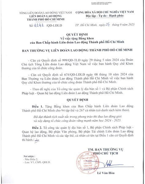 Theo Quyết định số 2242/QĐ-LĐLĐ ngày 26/9/2025 của Ban Thường vụ Liên đoàn Lao động Thành phố Hồ Chí Minh, 94 tập thể và 267 cá nhân đã được tặng Bằng khen vì đạt thành tích xuất sắc trong phong trào thi đua lao động giỏi và xây dựng tổ chức công đoàn vững mạnh năm học 2024 - 2025. Trong danh sách này, Công đoàn cơ sở Trường Đại học Văn Lang có 10 tập thể và 28 cá nhân được nhận Bằng khen cấp thành phố.
